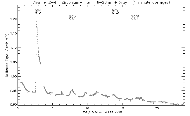 event begin max end class region ----- ----- ----- ----- ----- ------ 6690 02:29 02:40 02:50 M1.4 4366 6710 07:25 07:40 07:56 C1.1 4366 6760 13:34 13:41 13:50 C1.0 4366 6770 16:20 16:36 16:57 C1.1 4366